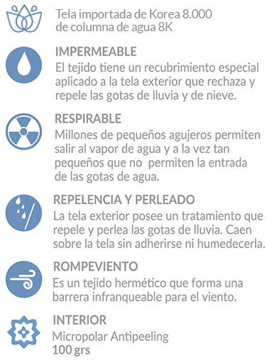 - Cierres exteriores impermeables. Bolsillos internos. Bolsillo portapase